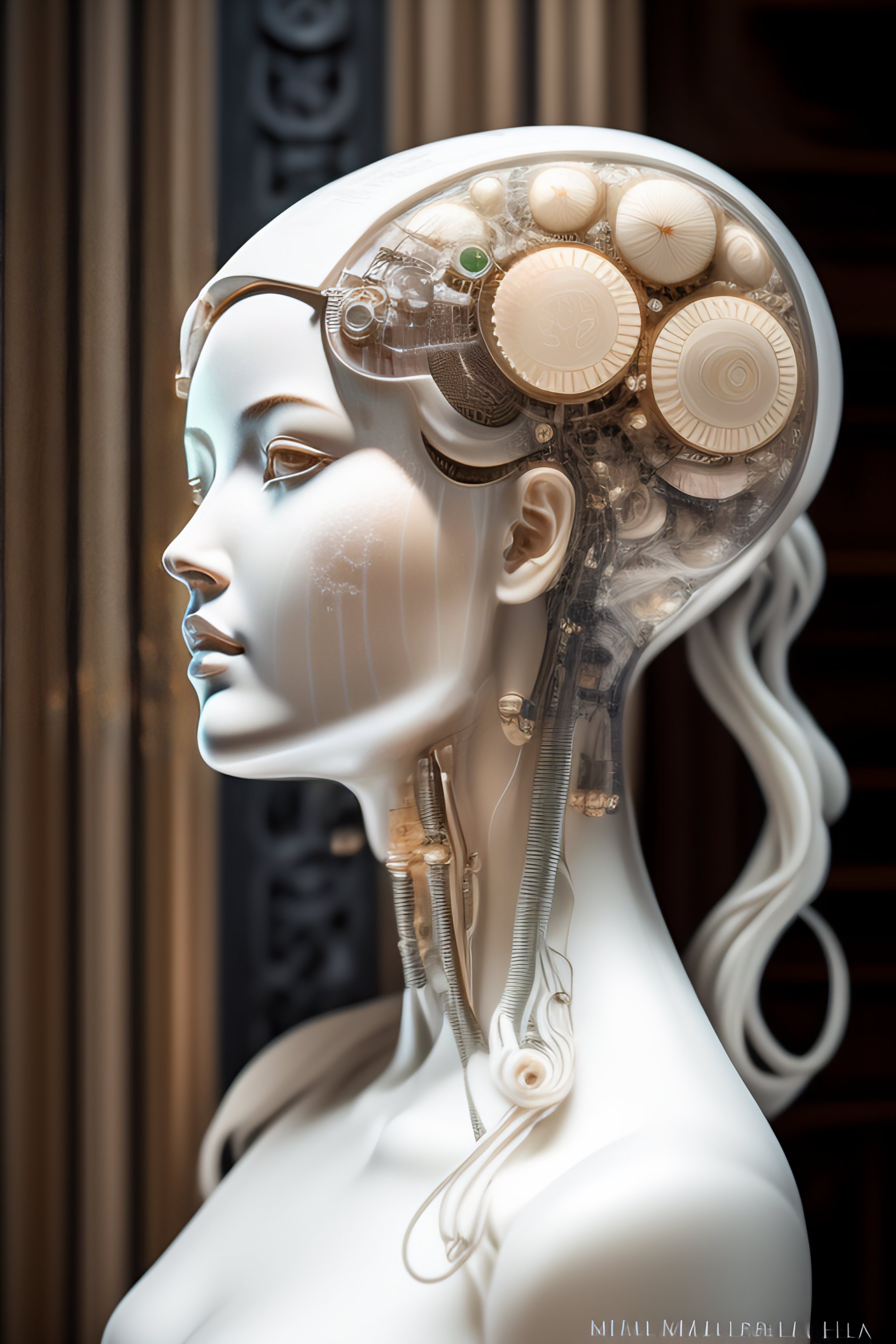 electronic system on head humanoid |cyborg woman| with a visible detailed brain| with a visible detailed heart| muscles cable wires| biopunk| cybernetic| cyberpunk| white marble bust| canon m50| 100mm| sharp focus| smooth| hyperrealism| highly detailed| intricate details| carved by michelangelo